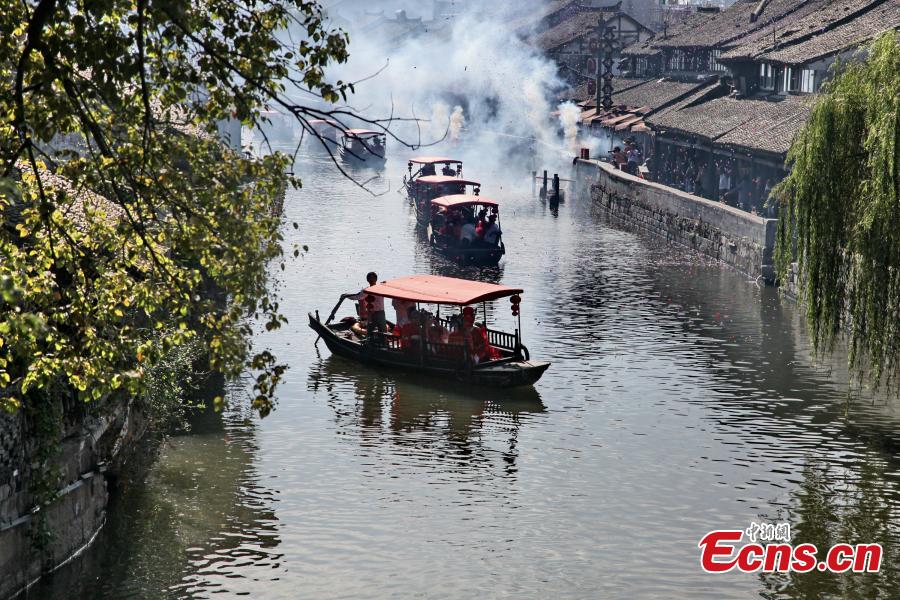 A traditional Chinese wedding ceremony for 20 foreign couples is held in Fengjing, an ancient water town of Shanghai on Sunday, September 21, 2014. Couples from 14 countries including India, Singapore, Afghanistan, Spain, and Poland tied the knot and experienced local ethnic customs at the event.