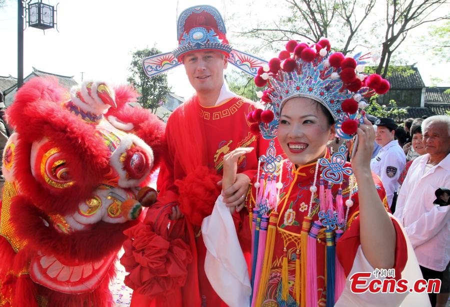A traditional Chinese wedding ceremony for 20 foreign couples is held in Fengjing, an ancient water town of Shanghai on Sunday, September 21, 2014. Couples from 14 countries including India, Singapore, Afghanistan, Spain, and Poland tied the knot and experienced local ethnic customs at the event.