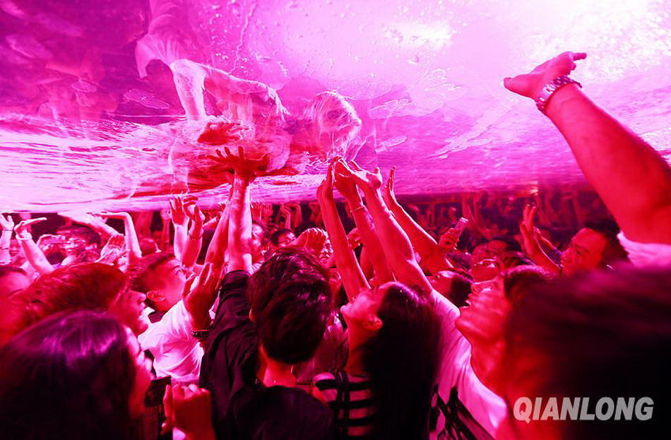 The interaction between the audience and the beautiful girl dressed in swimsui(qianlong.com/Qi Lianmin)