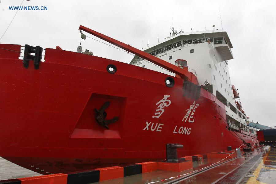 Icebreaker Xuelong, or "Snow Dragon," berthes at its home port after a two-and-a-half-month mission, in Shanghai, east China, Sept. 23, 2014. Xuelong set out from Shanghai on July 11 and has since traveled some 22,000 km to explore key areas such as the Bering Sea, the Chukchi Sea and the Canada Basin. It traveled as far as 81.11 degrees north latitude and 156.30 degrees east longitude, the team said. (Xinhua/Ding Ting) |