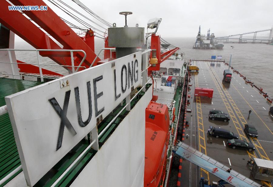 Icebreaker Xuelong, or "Snow Dragon," berthes at its home port after a two-and-a-half-month mission, in Shanghai, east China, Sept. 23, 2014. Xuelong set out from Shanghai on July 11 and has since traveled some 22,000 km to explore key areas such as the Bering Sea, the Chukchi Sea and the Canada Basin. It traveled as far as 81.11 degrees north latitude and 156.30 degrees east longitude, the team said. (Xinhua/Ding Ting) |