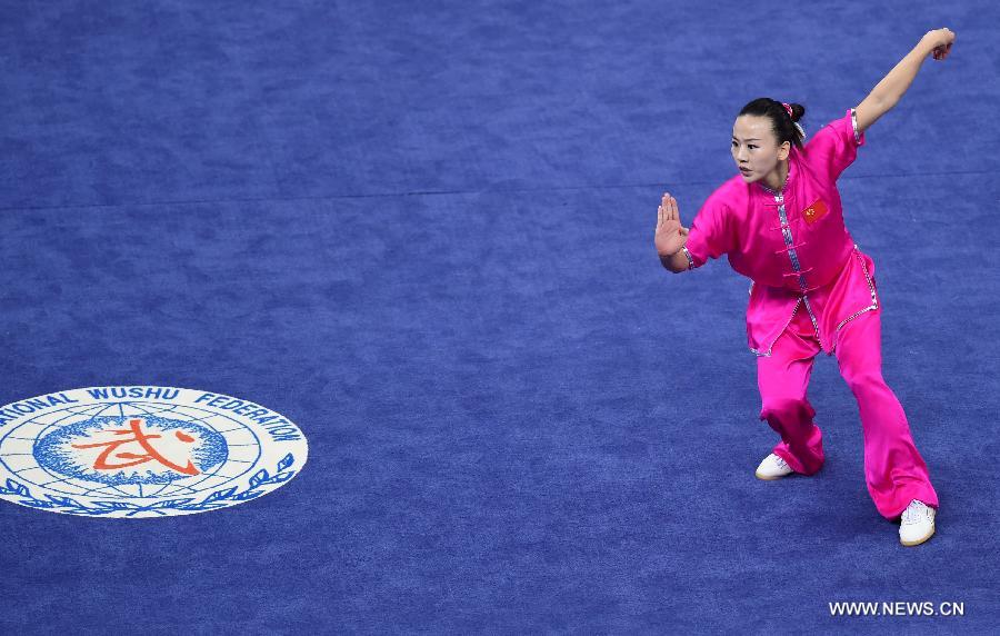 Kan Wencong of China performs during the women's Changquan final of Wushu competition at the 17th Asian Games in Incheon, South Korea, Sept. 23, 2014. Kan Wencong won the gold medal. (Xinhua/Lin Yiguang)