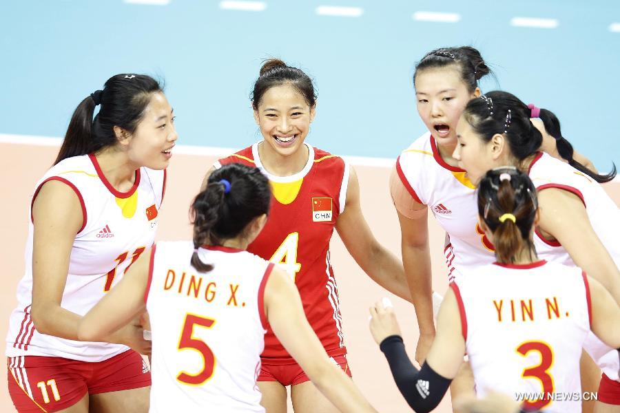 Players of China celebrate during the women's volleyball preliminary round match against China's Hong Kong at the 17th Asian Games in Incheon, South Korea, Sept. 23, 2014. China won 3-0. (Xinhua/Meng Yongmin)