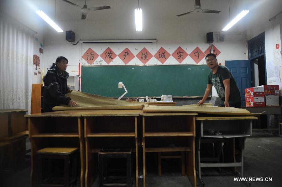Government staff prepare beds in Hepu Primary School at Hepu Township of Xiangshan County, east China's Zhejiang Province, Sept. 22, 2014. The 16th typhoon (tropical storm level) this year made the 4th landfall in Hepu Township of Xiangshan County in Zhejiang Province at 7:35 p.m. on Monday. (Xinhua/Han Chuanhao) |