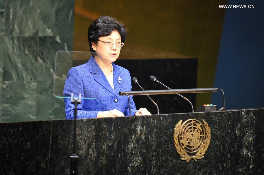 Li Bin, minister in charge of the National Health and Family Planning Commission of China, speaks during a special session of the UN General Assembly on the follow-up to the Program of Action of the International Conference on Population and Development, at the UN headquarters in New York, on Sept. 22, 2014. (Xinhua/Niu Xiaolei) |