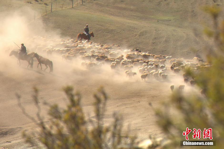 The nomads in Altay prefecture, northwest China's Xinjiang Uygur autonomous region, migrated to winter pasture with hundreds of thousands of cattle and sheep every September.(Chinanews.com/Liu Shihe)