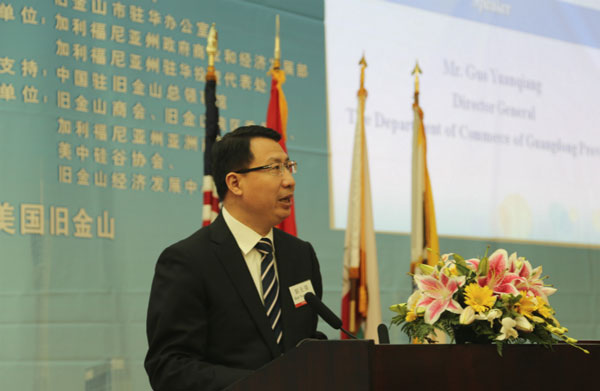 Guo Yuanqiang, director general of the Department of Commerce of Guangdong Province introduces opportunities in Guangdong Province at the conference on Monday. (People's Daily Online/Han Shasha)