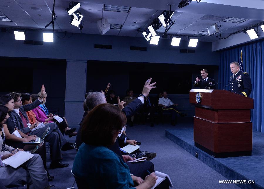 US Lieutenant General William Mayville (R) briefs the press during a briefing at the Pentagon in Washington D.C., capital of the United States, Sept. 23, 2014. The airstrikes on the Islamic State (IS) targets in Syria overnight Monday were "only the beginning" of a coalition effort of the Unites States and its Arabic allies in the anti-IS fight, a Pentagon spokesman said Tuesday. Meanwhile, U.S. Lieutenant General William Mayville detailed the airstrikes, saying that the initial attack came in three waves. The first was launched from sea by cruise missiles followed by waves of U.S. and Arab bombers and fighters. (Xinhua/Bao Dandan) |