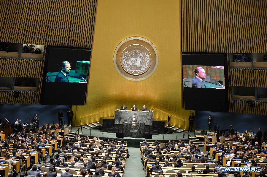 Leonardo DiCaprio, actor and UN Messenger of Peace, speaks during the opening ceremony of the Climate Summit at the UN headquarters in New York, on Sept. 23, 2014. The one-day summit, convened by UN Secretary-General Ban Ki-moon, is expected to galvanize global action on climate change. (Xinhua/Niu Xiaolei) |