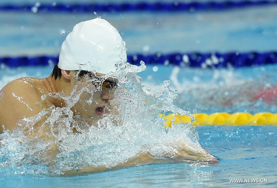 Li Xiang of China swims during the preliminary match of men's 100m breaststroke swimming at the 17th Asian Games in Incheon, South Korea, Sept. 24, 2014. Li Xiang advanced to the final with 1 minute and 01.91 seconds. (Xinhua/Gong Lei) |