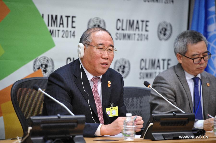 Xie Zhenhua(L), deputy director of China's National Development and Reform Commission, speaks during a press conference at the UN headquarters in New York, on Sept. 23, 2014. China pins high hopes on a new global climate change pact to be reached late next year, said Xie Zhenhua here Tuesday. (Xinhua/Niu Xiaolei) |
