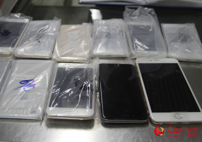 iPhone 6 smartphones seized by Shenzhen Customs are displayed on Sept. 22, 2014. Shenzhen Customs officers first seized three SLR camera lens in a man’s backpack, then eight new iPhone6 smartphones in three underpants he wore, worth about 40,000 yuan. Recently, more than 2,000 iPhone 6 smartphones have been confiscated since they hit shelves in Hong Kong last Friday. Some smugglers admitted to attempting to smuggle the new Smartphone onto the mainland, where they are still not legally available. (Photo: Shenzhen Customs)