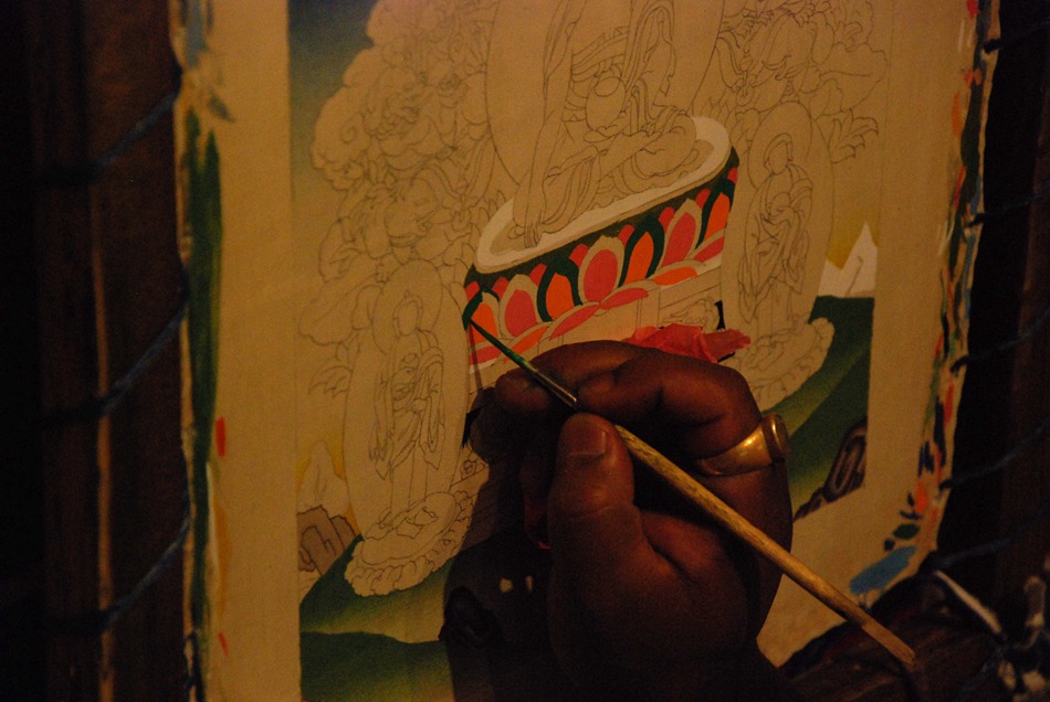 Rapp Bahadur Shrestha, a Nepalese artist, draws Thangka at the exhibition hall at the opening ceremony on Sept. 23, 2014. (People's Daily Online/Li Xiang)