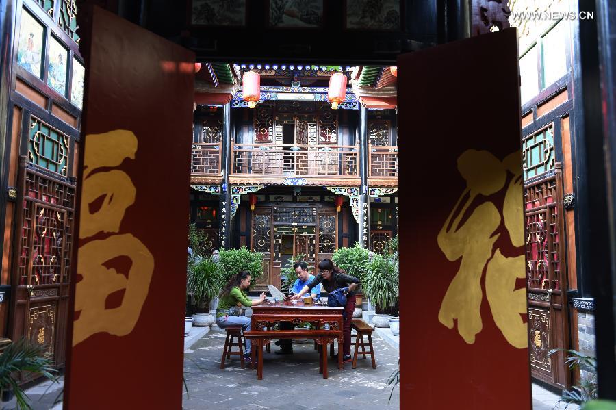 Tourists chat in a local inn in Pingyao County, north China's Shanxi Province, Sept. 19, 2014. Located in Jinzhong Basin of Shanxi Province, the 2700-year-old Pingyao Ancient Town is one of the most well-preserved ancient towns in China. Pingyao, which was added to the World Heritage List by UNESCO in 1997, attracts numerous tourists from all over the world. (Xinhua/Yan Yan) |