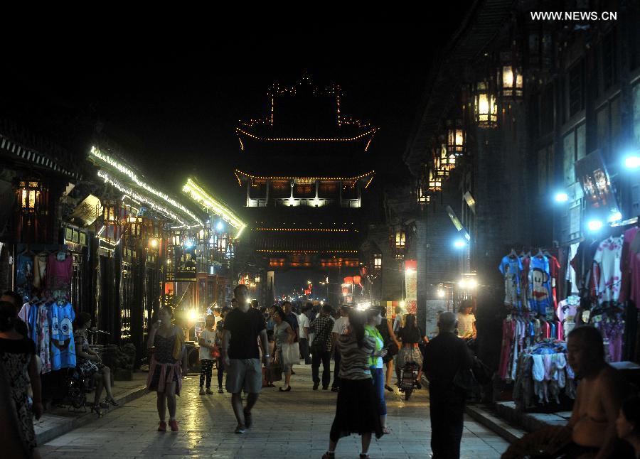 Tourists visit Pingyao Ancient Town, Pingyao County, north China's Shanxi Province, July 30, 2014. Located in Jinzhong Basin of Shanxi Province, the 2700-year-old Pingyao Ancient Town is one of the most well-preserved ancient towns in China. Pingyao, which was added to the World Heritage List by UNESCO in 1997, attracts numerous tourists from all over the world. (Xinhua/Yan Yan)