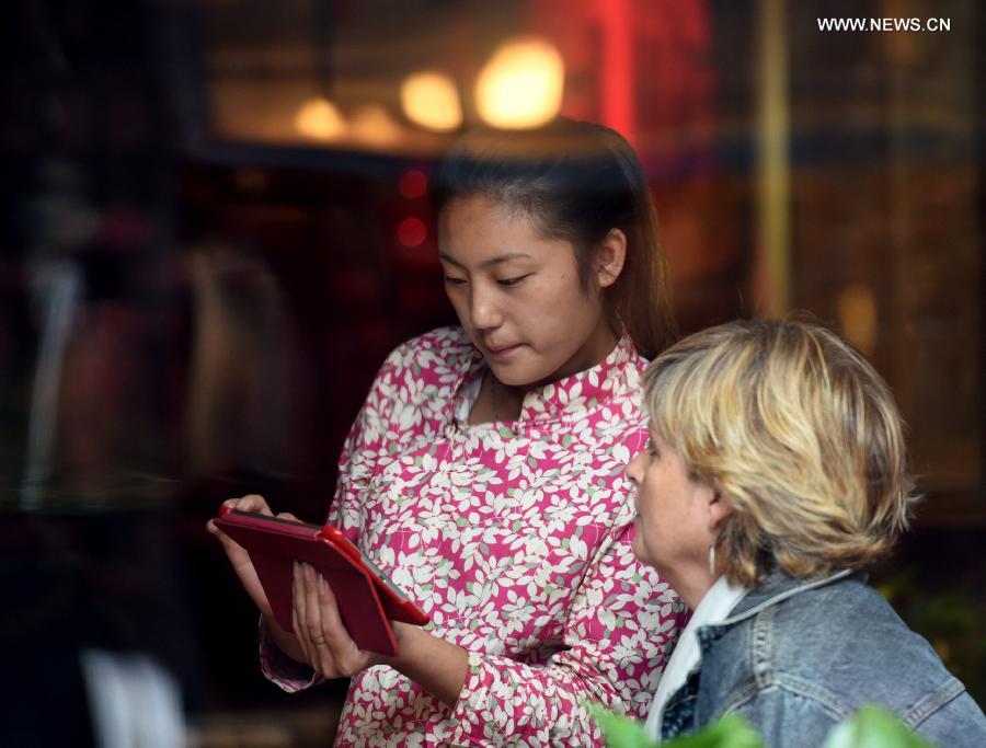 A local inn server chats with a foreign traveller in Pingyao County, north China's Shanxi Province, Sept. 19, 2014. Located in Jinzhong Basin of Shanxi Province, the 2700-year-old Pingyao Ancient Town is one of the most well-preserved ancient towns in China. Pingyao, which was added to the World Heritage List by UNESCO in 1997, attracts numerous tourists from all over the world. (Xinhua/Yan Yan) |