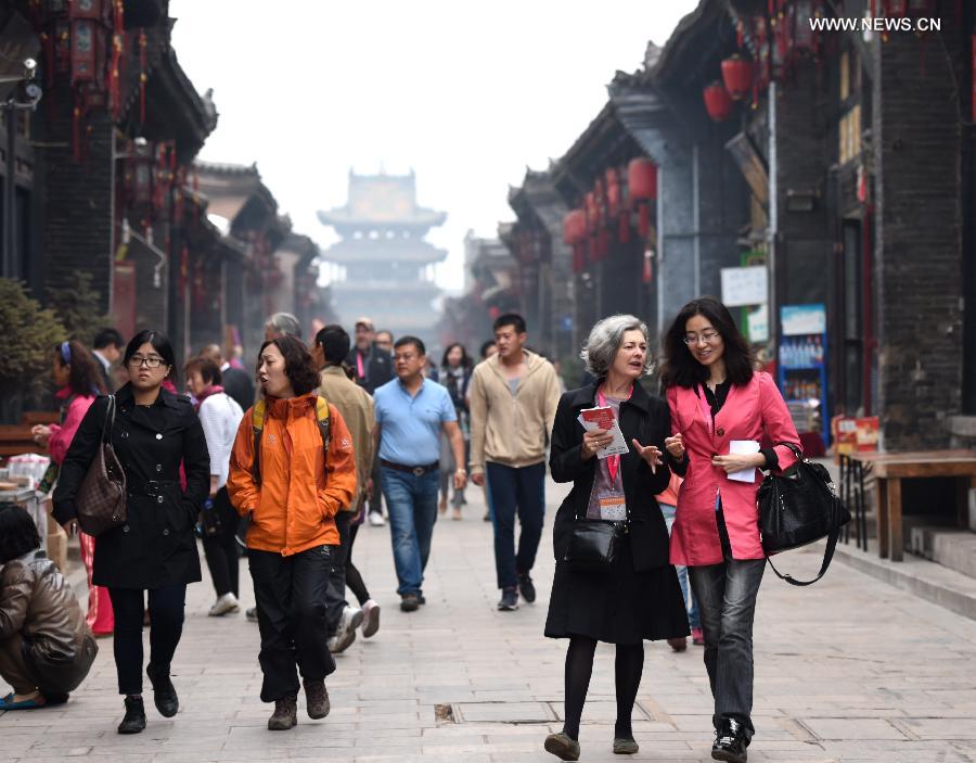 Tourists visit Pingyao Ancient Town, Pingyao County, north China's Shanxi Province, Sept. 19, 2014. Located in Jinzhong Basin of Shanxi Province, the 2700-year-old Pingyao Ancient Town is one of the most well-preserved ancient towns in China. Pingyao, which was added to the World Heritage List by UNESCO in 1997, attracts numerous tourists from all over the world. (Xinhua/Yan Yan) |