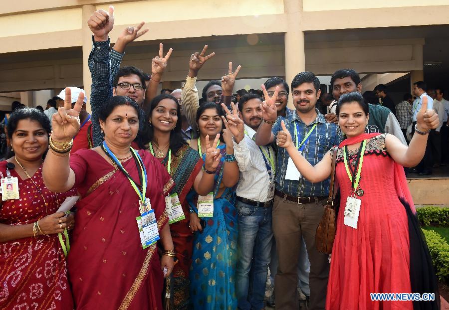 Scientists and officials of Indian Space Research Organisation pose for photos as they celebrate the success of Mars Orbiter Mission (MoM) at their Telemetry, Tracking and Command Network complex in Bangalore, India, Sept. 24, 2014. India Wednesday scripted history by becoming the world's first country to reach Mars in its maiden attempt. (Xinhua/Stringer) |