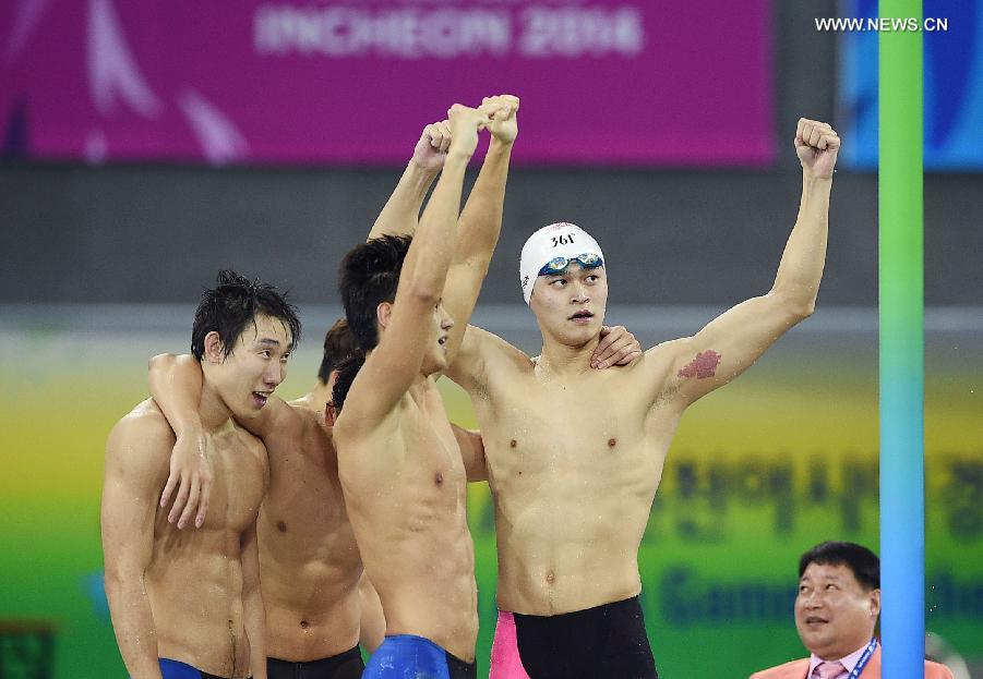 Chinese athlete Sun Yang (1st R) and his teammate Yu Hexin, Lin Yongqing and Ning Zetao celebrate after winning the men's 4×100m freestyle relay final of swimming event at the 17th Asian Games in Incheon, South Korea, Sept. 24, 2014. China won the gold medal with 3 minutes and 13.47 seconds. (Xinhua/Wang Peng) |
