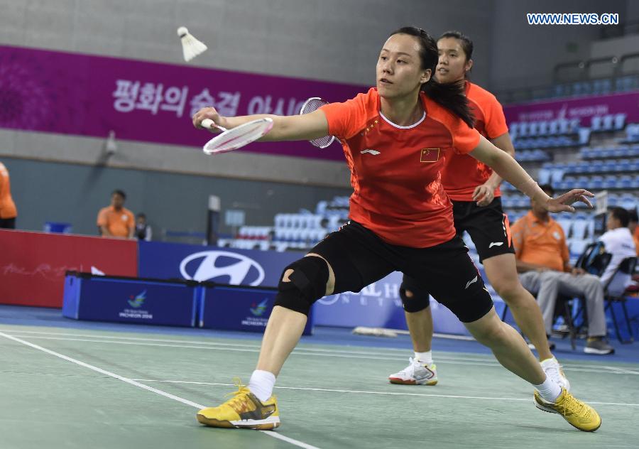 Zhao Yunlei (front) of China returns the shuttlecock during the women's doubles quarterfinal match of badminton against Kim Hana and Jung Kyungeun of South Korea at the 17th Asian Games in Incheon, South Korea, Sept. 25, 2014. Tian Qing and Zhao Yunlei won 2-1. (Xinhua/Ye Pingfan) |