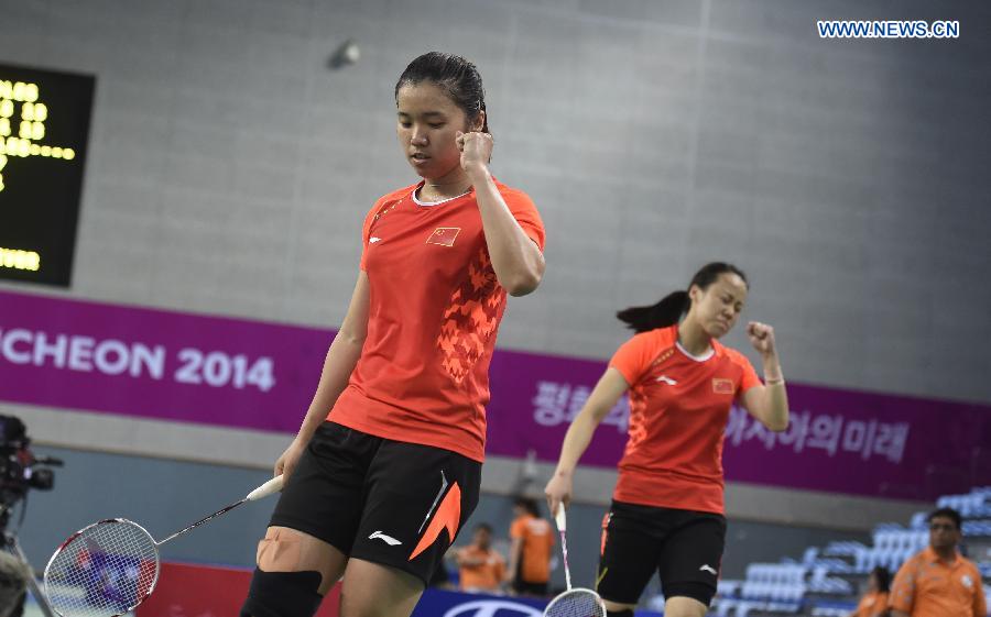 Tian Qing (front) and Zhao Yunlei of China celebrate during the women's doubles quarterfinal match of badminton against Kim Hana and Jung Kyungeun of South Korea at the 17th Asian Games in Incheon, South Korea, Sept. 25, 2014. Tian Qing and Zhao Yunlei won 2-1. (Xinhua/Ye Pingfan) |