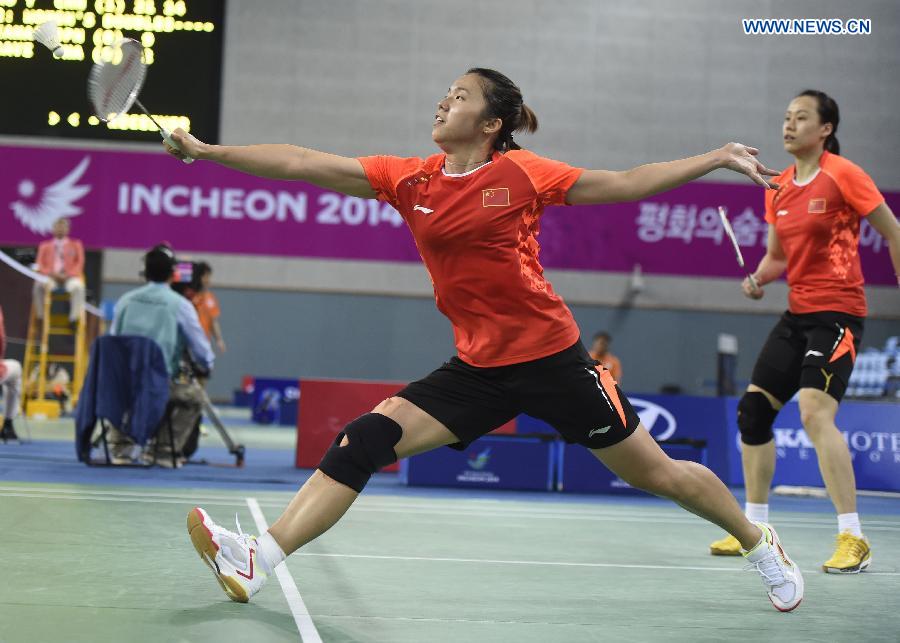 Tian Qing (L) of China returns the shuttlecock during the women's doubles quarterfinal match of badminton against Kim Hana and Jung Kyungeun of South Korea at the 17th Asian Games in Incheon, South Korea, Sept. 25, 2014. Tian Qing and Zhao Yunlei won 2-1. (Xinhua/Ye Pingfan) |