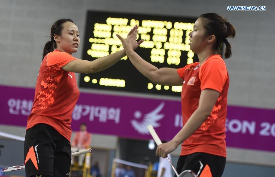 Tian Qing (R) and Zhao Yunlei of China celebrate during the women's doubles quarterfinal match of badminton against Kim Hana and Jung Kyungeun of South Korea at the 17th Asian Games in Incheon, South Korea, Sept. 25, 2014. Tian Qing and Zhao Yunlei won 2-1. (Xinhua/Ye Pingfan) |