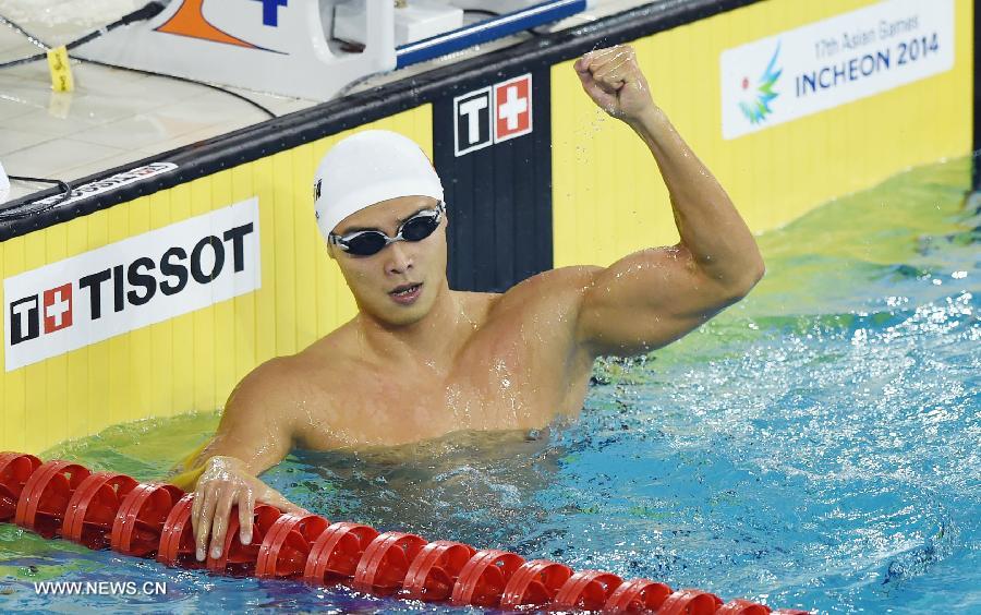 Shi Yang of China celebrates after the men's 50m butterfly final of swimming event at the 17th Asian Games in Incheon, South Korea, Sept. 25, 2014. Shi Yang won the gold medal with 23.46 seconds. (Xinhua/Lin Yiguang)