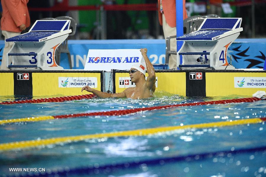 Shi Yang of China celebrates after winning the men's 50m butterfly final of swimming event at the 17th Asian Games in Incheon, South Korea, Sept. 25, 2014. Shi Yang won the gold medal with 23.46 seconds. (Xinhua/Wang Peng)