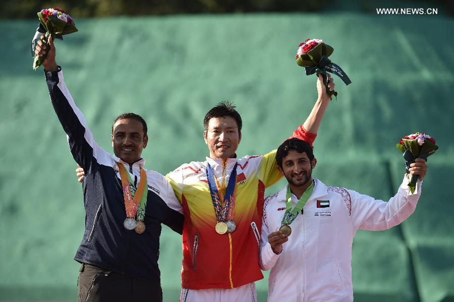 Gold medalist Hu Binyuan of China (C), silver medalist Aldeehani Fehaid of Kuwait (L) and bronze medalist Almaktoum Juma of United Arab Emirates pose during the awarding ceremony of the double trap men's competition of shooting event at the 17th Asian Games in Incheon, South Korea, Sept. 25, 2014. (Xinhua/Lui Siu Wai) |