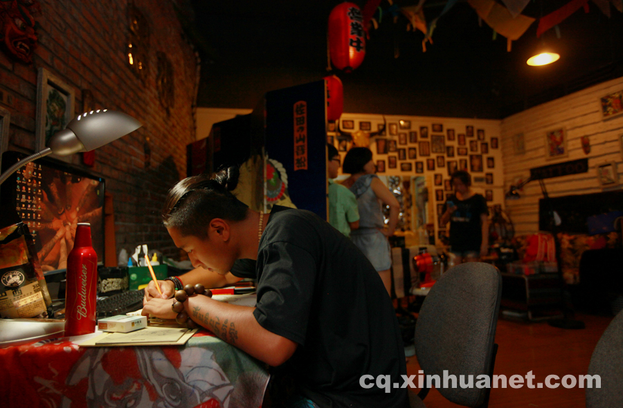 Pan's assistant creates his tattoo works on July 21, 2014. Pan graduated from an academy of fine art; his dream is to open a tattoo shop. "My family support fully on my career and my dream, they don't think it is odd or weird," he said. (Xinhua News Agency/Peng Bo) |