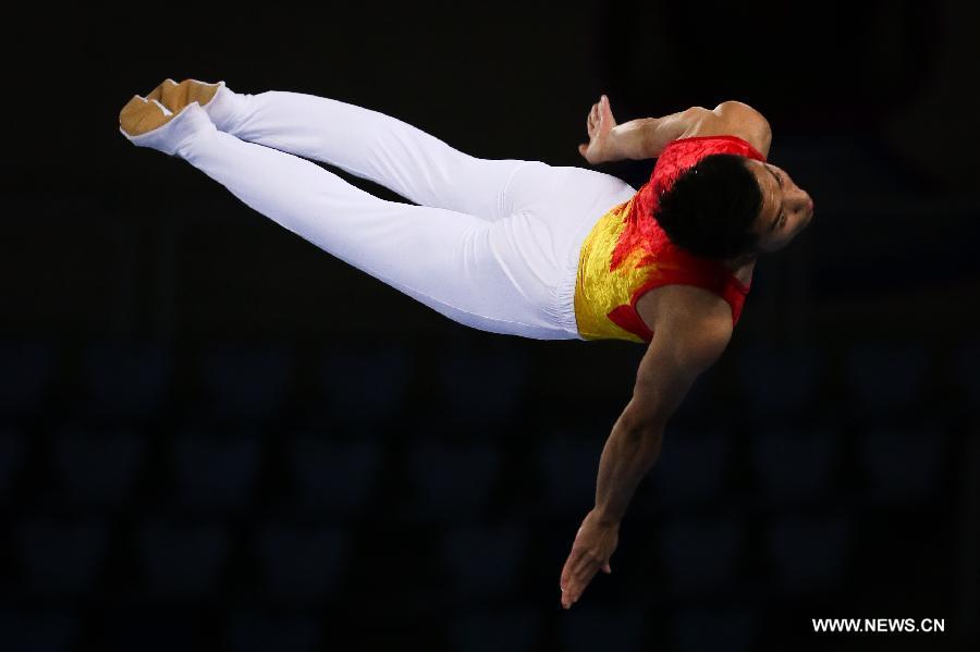 Dong Dong of China competes during the men's final of gymnastics trampoline event at the 17th Asian Games in Incheon, South Korea, Sept. 26, 2014. Dong Dong won the gold medal with 62.480 points. (Xinhua/Zheng Huansong)