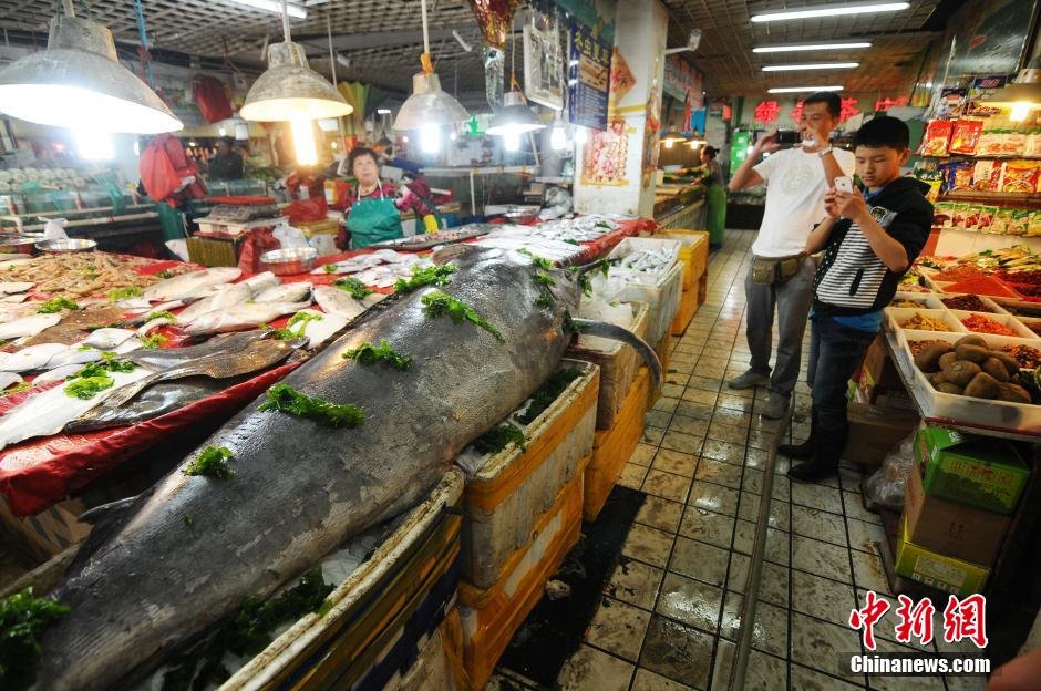 A 3.06-meter-long and 206-kilograme-weight giant swordfish is seen at a fish stall in a supermarket of Qingdao City, east China's Shandong Province on September 24, 2014. [Photo: Chinanews.com/ Wang Haibin]