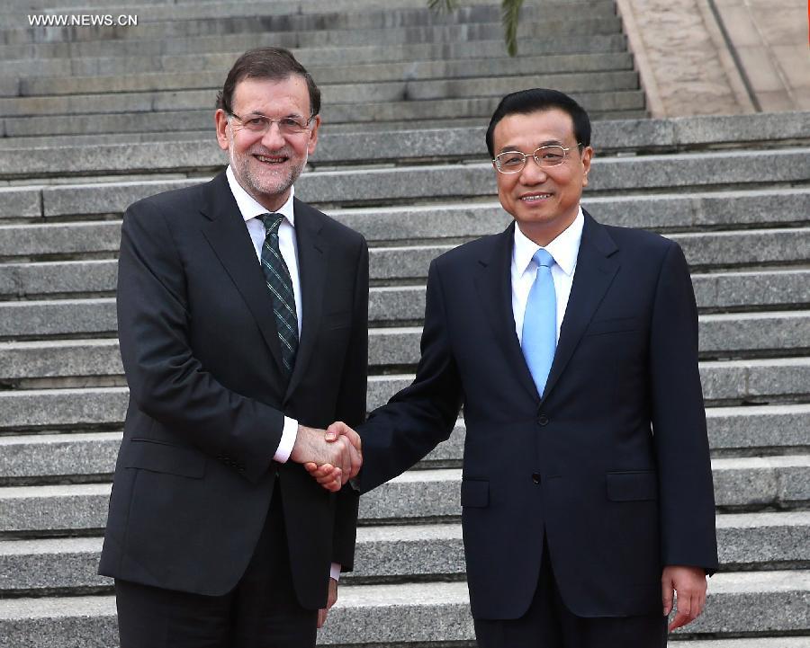Chinese Premier Li Keqiang(R) holds a welcoming ceremony for Spanish Prime Minister Mariano Rajoy before their talks in Beijing, capital of China, Sept. 25, 2014. (Xinhua/Pang Xinglei)