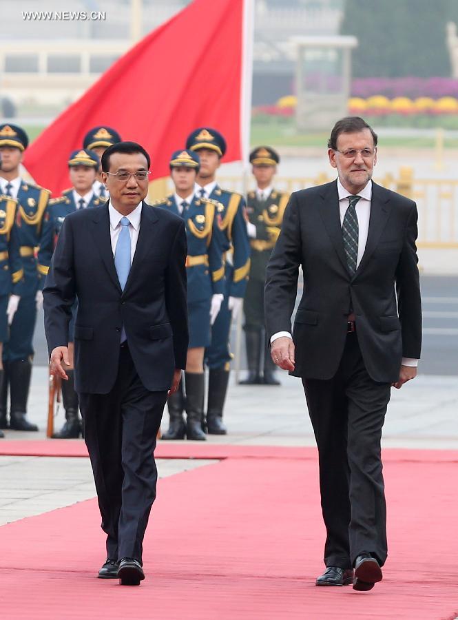 After talks between Chinese Premier Li Keqiang and Rajoy at the Great Hall of the People on Thursday afternoon, the two sides signed 14 documents covering cooperation in areas including alfalfa export, film, nuclear power, telecommunication, finance, wind electricity, sea water desalination and tourism.