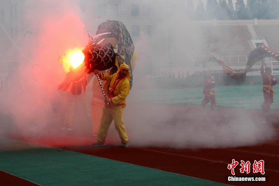 70-year-old men perform fire-dragon dance to celebrate the opening the 21st South Dstrict (Qingdao) senior games in Qingdao Tiantai stadium on Sept. 24, 2014. More than 3,000 old men between 60 and 70 years took part in the games. (Chinanews.com/Xu Chongde)