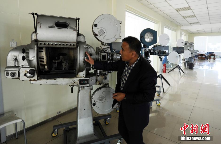 Zhao Bingcheng organizes his collection of film projectors, Sept. 24, 2014.(Chinanews/Zhang Yao)