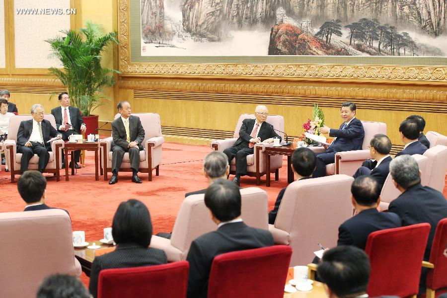 Xi Jinping (1st R rear), general secretary of the Communist Party of China Central Committee, meets with a Taiwanese delegation of pro-reunification groups at the Great Hall of the People in Beijing, capital of China, Sept. 26, 2014. (Xinhua/Yao Dawei) |