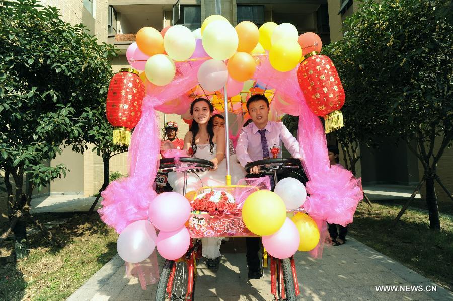 Bride Jiang Yan and bridegroom Huang Bo ride a four-wheel wedding bicycle in Changsha, capital of central China's Hunan Province, Sept. 27, 2014. The couple, together with their riding mates, celebrated their wedding by riding bicycles on Saturday. (Xinhua/Li Ga) |