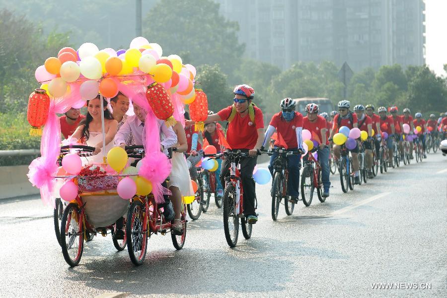 Bride Jiang Yan and bridegroom Huang Bo ride a four-wheel wedding bicycle in Changsha, capital of central China's Hunan Province, Sept. 27, 2014. The couple, together with their riding mates, celebrated their wedding by riding bicycles on Saturday. (Xinhua/Li Ga) |