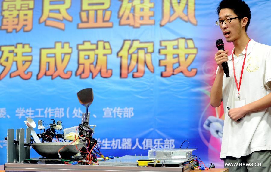 A robot cooks in the 14th RoboGame Robot Competition at University of Science and Technology of China in Hefei, capital of east China's Anhui Province, Sept. 27, 2014. The robot competition, with the participation of a total of 36 teams, aims to improve the innovation capability and strengthen the hand-on practice of university students.(Xinhua/Liu Junxi)