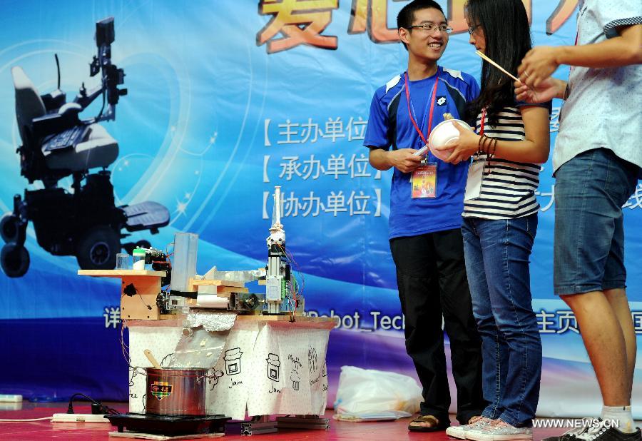A robot uses a microwave oven to cook noodles in the 14th RoboGame Robot Competition at University of Science and Technology of China in Hefei, capital of east China's Anhui Province, Sept. 27, 2014. The robot competition, with the participation of a total of 36 teams, aims to improve the innovation capability and strengthen the hand-on practice of university students.(Xinhua/Liu Junxi) |