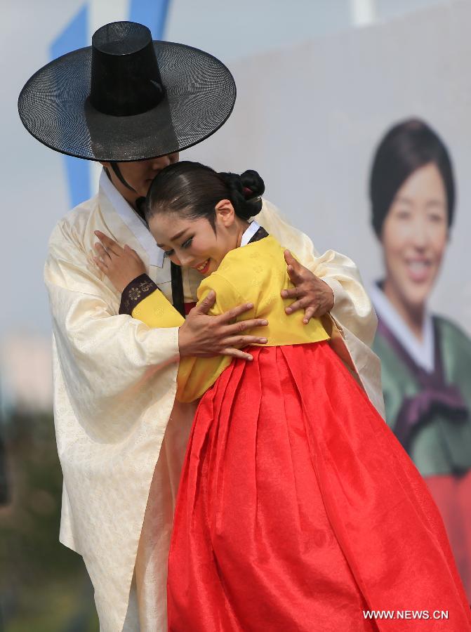 Actors perform during a wedding ceremony at the flag plaza of athletes' village of the 17th Asian Games in Incheon, South Korea, Sept. 27, 2014. A South Korean traditional wedding ceremony with a theme of "a festival event has been held" was held here on Saturday. The ceremony is for actual marriage of one of the Incheon Asian Games Organizing Committee (IAGOC). (Xinhua/Meng Chenguang) |
