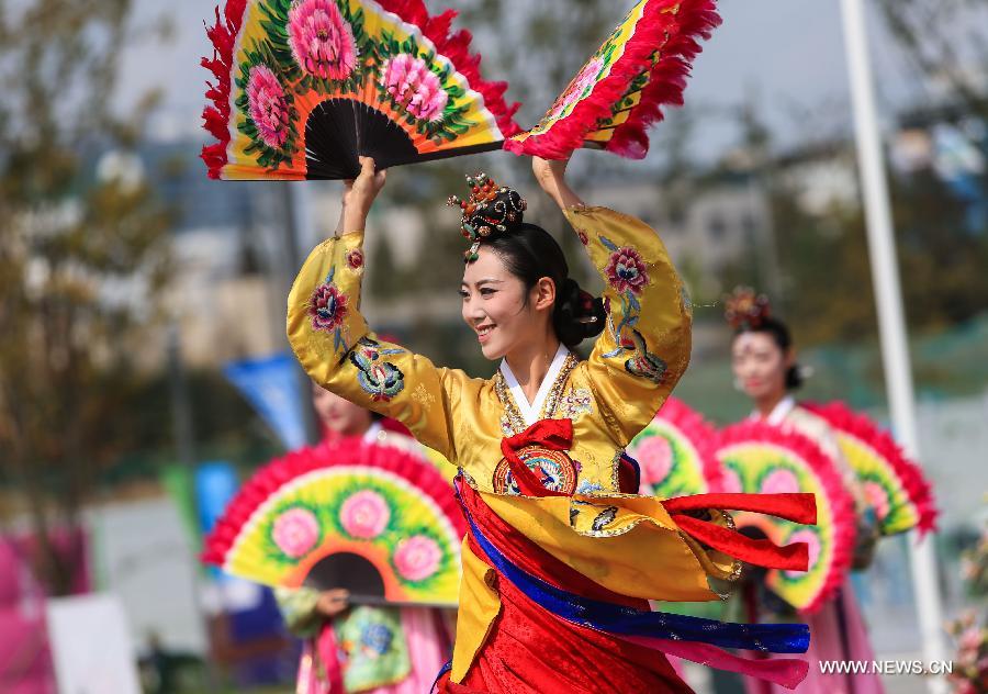 An actress performs during a wedding ceremony at the flag plaza of athletes' village of the 17th Asian Games in Incheon, South Korea, Sept. 27, 2014. A South Korean traditional wedding ceremony with a theme of "a festival event has been held" was held here on Saturday. The ceremony is for actual marriage of one of the Incheon Asian Games Organizing Committee (IAGOC). (Xinhua/He Changshan)