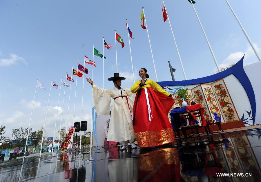 Actors perform during a wedding ceremony at the flag plaza of athletes' village of the 17th Asian Games in Incheon, South Korea, Sept. 27, 2014. A South Korean traditional wedding ceremony with a theme of "a festival event has been held" was held here on Saturday. The ceremony is for actual marriage of one of the Incheon Asian Games Organizing Committee (IAGOC). (Xinhua/He Changshan) |