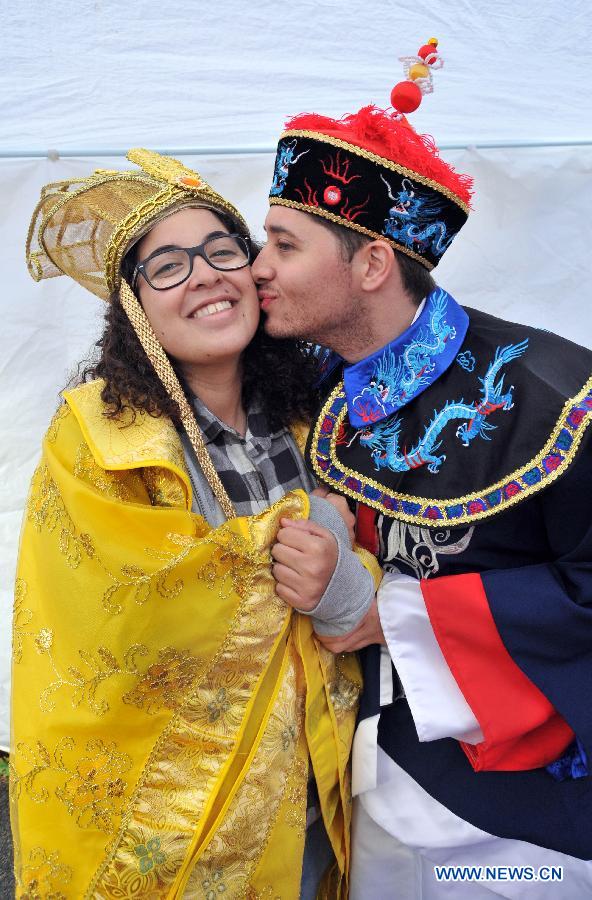 Estonian people dress up Chinese costumes for showing up in Talinn, Estonia, on Sept. 27, 2014. Various Chinese cultural activities marking the first Confucius Institute Day or 10th anniversary of the institute's establishment held at campus at Tallinn University in Tallinn, captital of Estonia on Saturday. (Xinhua/Viktor Vesterinen) |