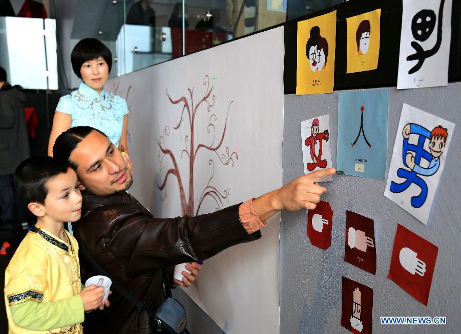 A father and his son attend an activity as a part of celebration of the Confucius Institute Day in the city hall of Reykjavik, Iceland Sept. 27, 2014. The open house activity of Chinese language and culture, held by Northern Light Confucius Institute in Iceland, attracted more than 600 local visitors.(Xinhua/Huang Xiaonan) |