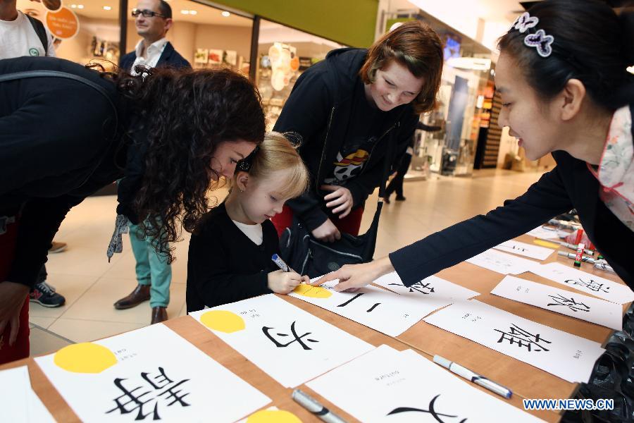 A teacher from Confucius Institute Bratislava bureau (R) teaches Slovakians Chinese calligraphy in Bratislava, Slovakia, Sept. 27, 2014. The Day of the Confucius Institute is celebrated worldwide on Sept. 27, marking the 10th anniversary of the founding of Confucius Institutes. (Xinhua/Andrej Klizan) |