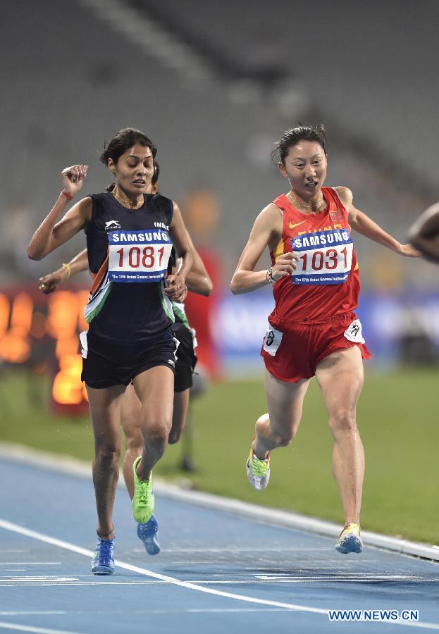 Li Zhenzhu (R) of China competes during the women's 3,000m steeplechase final match of athletics at the 17th Asian Games in Incheon, South Korea, Sept. 27, 2014. (Xinhua/Lui Siu Wai)