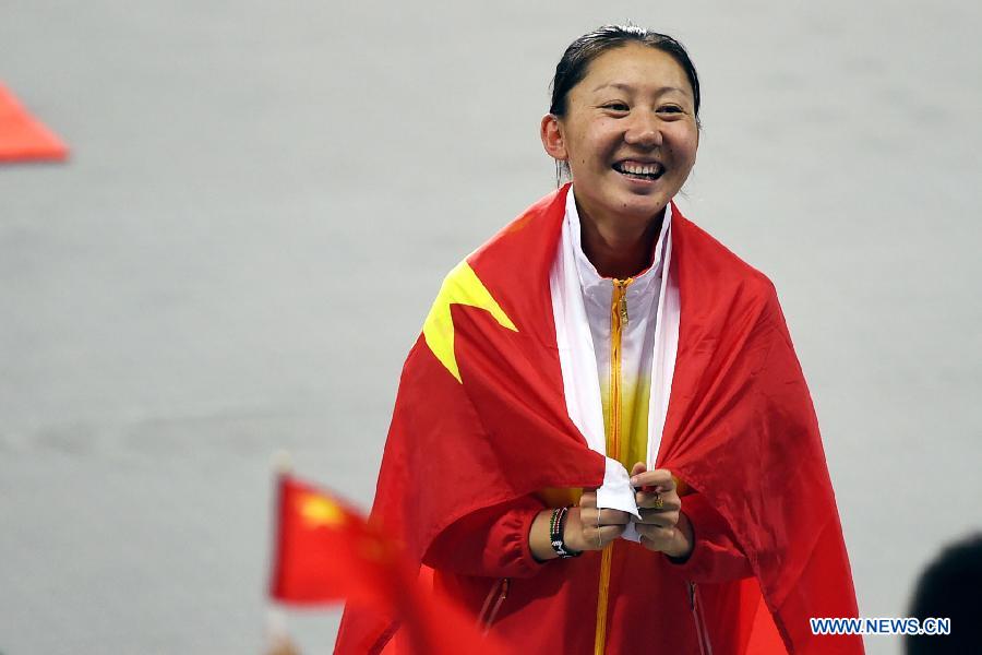 Li Zhenzhu of China celebrates after the women's 3,000m steeplechase final match of athletics at the 17th Asian Games in Incheon, South Korea, Sept. 27, 2014. (Xinhua/Gong Lei)